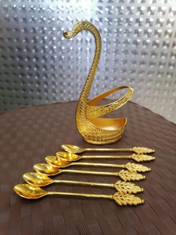 Bring royal elegance to your dining table with this premium gold swan spoon set. Designed with a stunning swan-shaped stand, this set includes 6 finely crafted metal spoons ideal for tea, coffee, desserts, and serving.